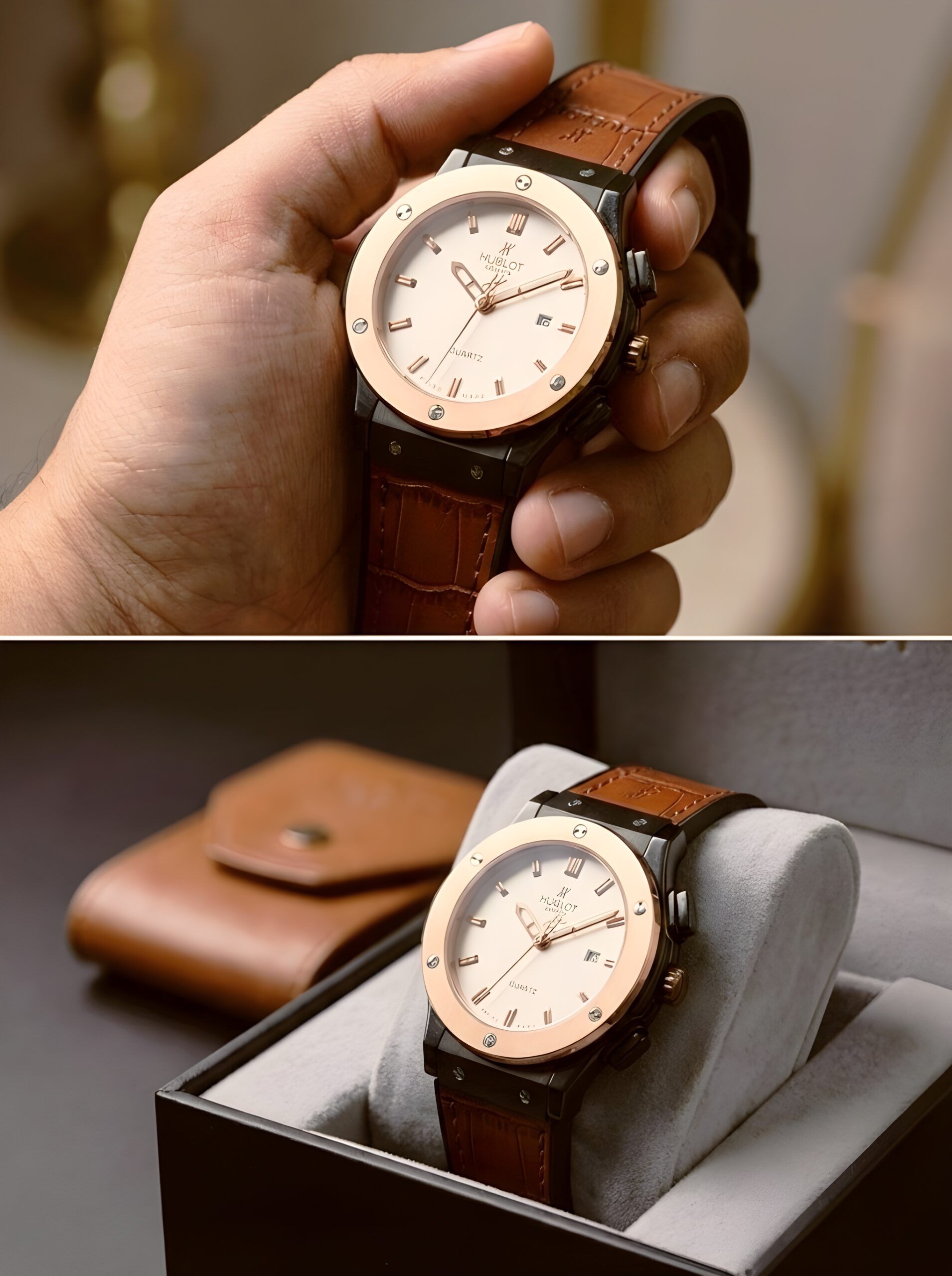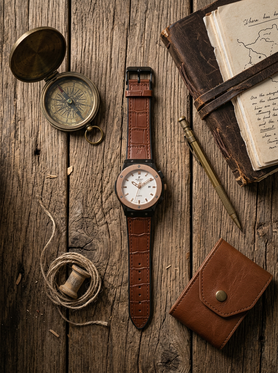 Inspired by the bold craftsmanship of Hublot, this design reflects modern luxury with classic aesthetics. The combination of light gold and brown leather creates a rich and sophisticated look that never goes out of style.
