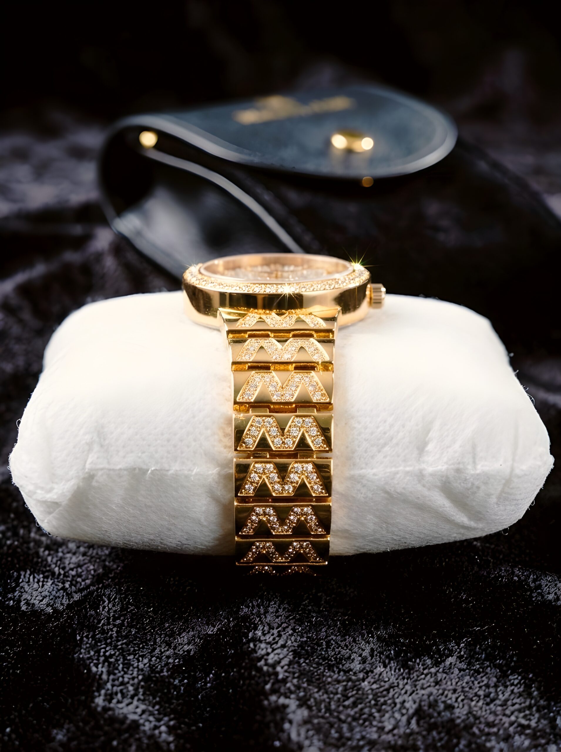 The golden metal strap is adorned with a diamond-studded pattern, adding a bridal and party-wear touch. This watch is specially designed for women who want to make a classy and bold fashion statement.